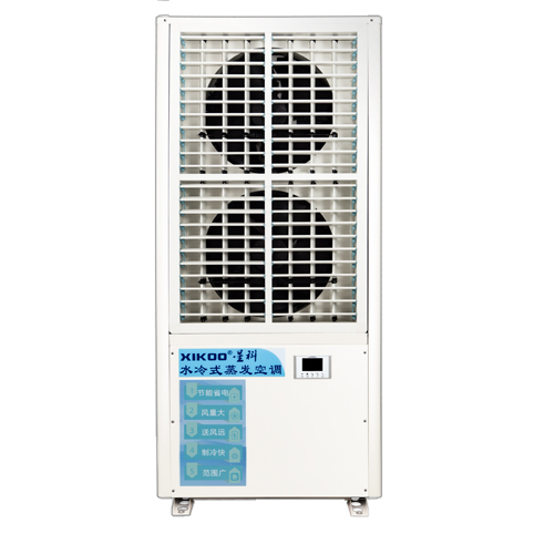 首先由外機采用濕簾蒸發式冷凝的技術來給循環水降溫,水溫降至常溫后流經內機的熱交換系統(此時壓縮機已運作,已將冷媒壓縮成高溫高壓狀態)從而帶走大部分高溫冷媒的熱量而形成常溫冷媒,常溫冷媒再經過節流閥后變成低溫低壓的冷媒,輸送至內機上半部分的蒸發器而吹出冷風;